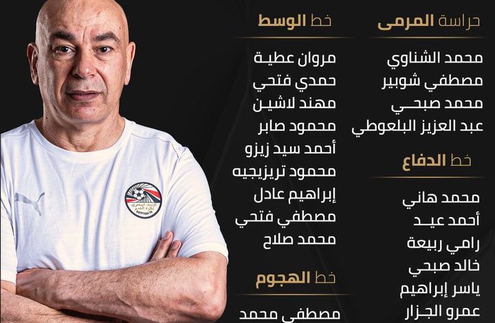 وتقام المباراتان في الثامن والـ12 من أكتوبر الجاري. وقال المركز الإعلامي للاتحاد المصري لكرة القدم اليوم الأحد، إن القائمة ضمت كلا من محمد الشناوي ومصطفى شوبير ومحمد صبحـي وعبد العزيز البلعوطي في حراسة المرمي بجانب محمد هاني وأحمد عيـد ورامي ربيعة وخالد صبحي وياسر إبراهيم وعمرو الجـزار وحسام عبد المجيد ومحمد حمدي وأحمد نبيل كوكـا ومروان عطيـة وحمدي فتحي ومهند لاشيـن ومحمود صابر وأحمد سيد زيزو ومحمود تريزيغيه وإبراهيم عادل مصطفي فتحي ومحمد صلاح ومصطفي محمد وأسامة فيصل.